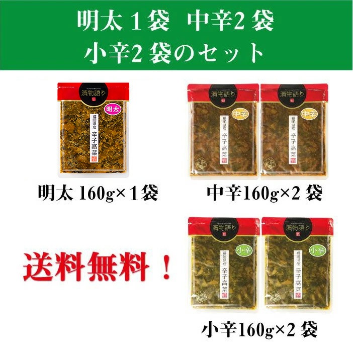 | 内容量 | 明太高菜160g×1袋+中辛160g×2袋+小辛160g×2袋 |