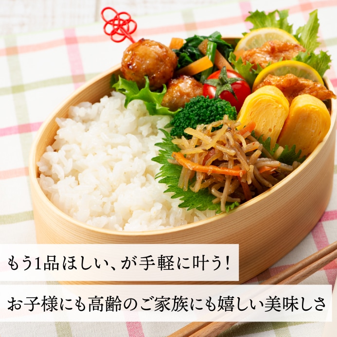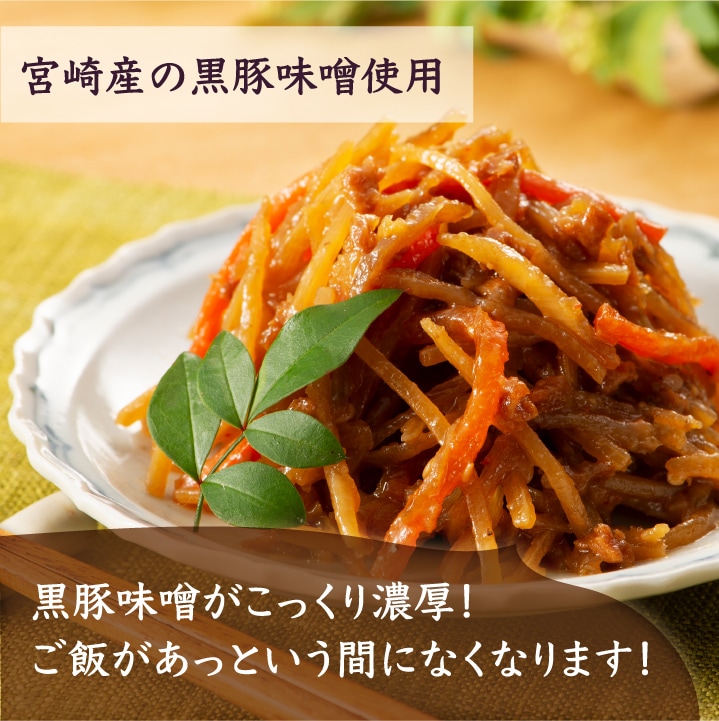 鹿児島県産黒豚を使用した黒豚味噌を調味料として使用し、濃厚で美味しいきんぴらごぼうに仕上げました。
